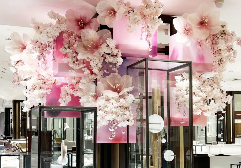 Isetan Display / 2025Hanabanasai 伊勢丹新宿店2025花々祭の館内装飾をデザインしました。桜をモチーフしたキービジュアルに合わせ、満開の桜を館内各所に散りばめました。 AD&D:…